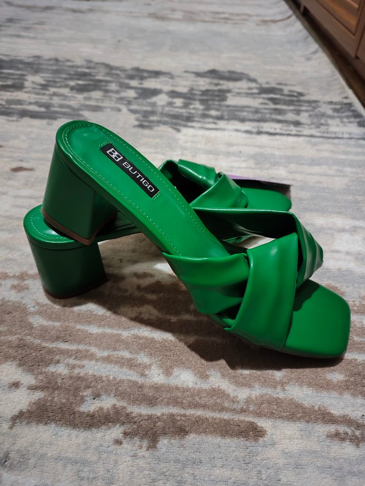 Parlak yeşil renkte, tokalı ve blok topuklu kadın terliği. Kauçuk malzemeden yapılmış, günlük kullanıma uygun şık bir tasarım.