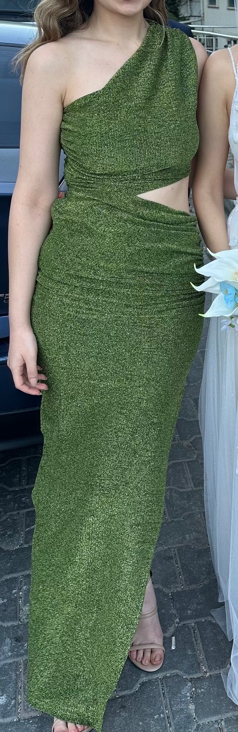 Parlak yeşil, uzun kesimli abiye elbise, simli kumaş ve bohem-avant-garde tarzıyla dış mekan etkinliklerine uygun.