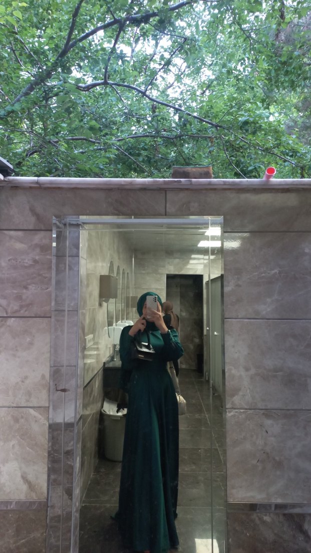 Parlak yeşil, drapeli ve uzun kollu yüksek yakalı, vücuda oturan uzun elbise. Günlük kullanıma uygun, modest ve gotik tarzda.