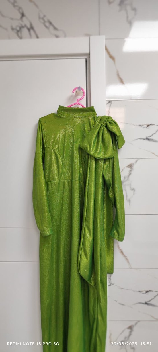 Parlak yeşil renkte, uzun kollu ve yüksek yakalı, bol kesim drapeli kadın elbisesi, avant-garde sokak tarzı için uygundur. Bir kere giyildi düğünde abiyedir özel dikim