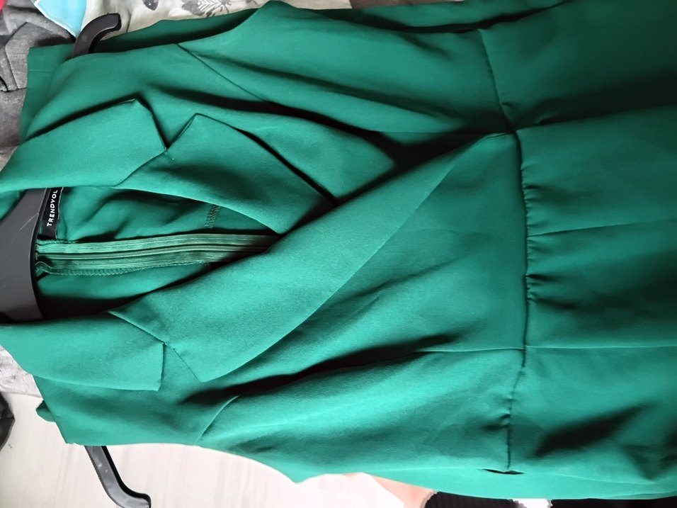Sentetik kumaştan yapılmış, parlak yeşil renkli, drapeli ve kesimli yakalı,