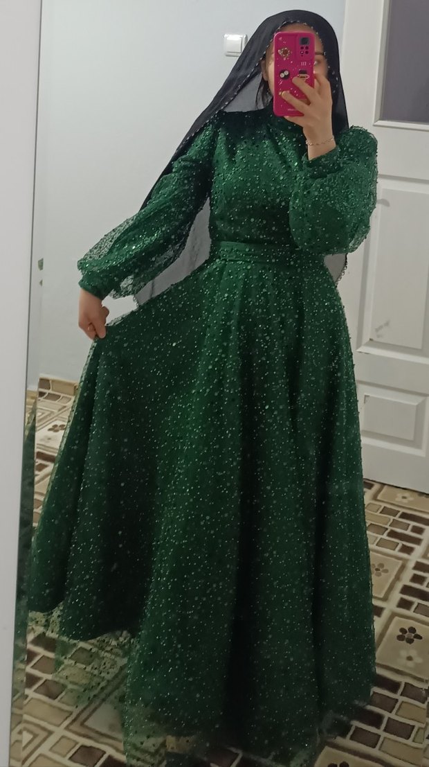Parlak yeşil renkte, uzun kollu ve tek parça abiye elbise. Simli detayları, tekne yakası ve bol kesimiyle düğünler için uygundur. ✨