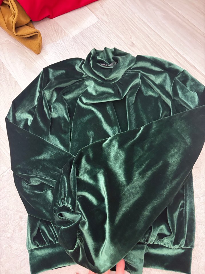 Parlak yeşil, yumuşak ve ipeksi kumaştan yapılmış, uzun kollu ve boğazlı, salaş kesim . Parti için uygun.