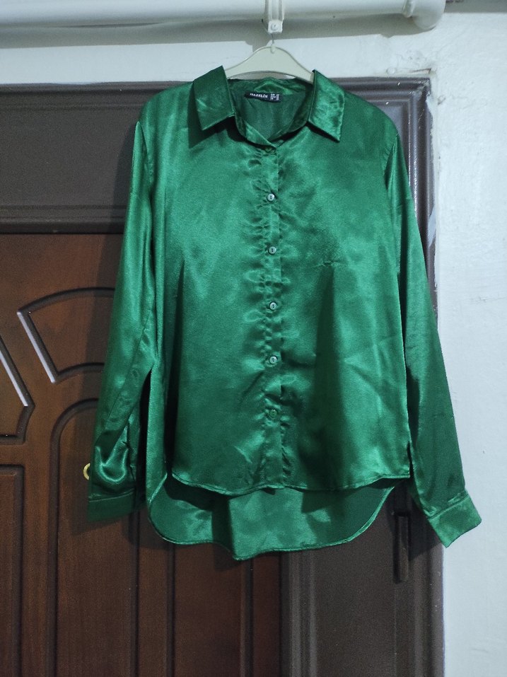 Parlak yeşil, ipeksi kumaştan uzun kollu, düğmeli ve notalı yakalı bol kesim kadın gömleği. Ofis için uygun midi uzunlukta.