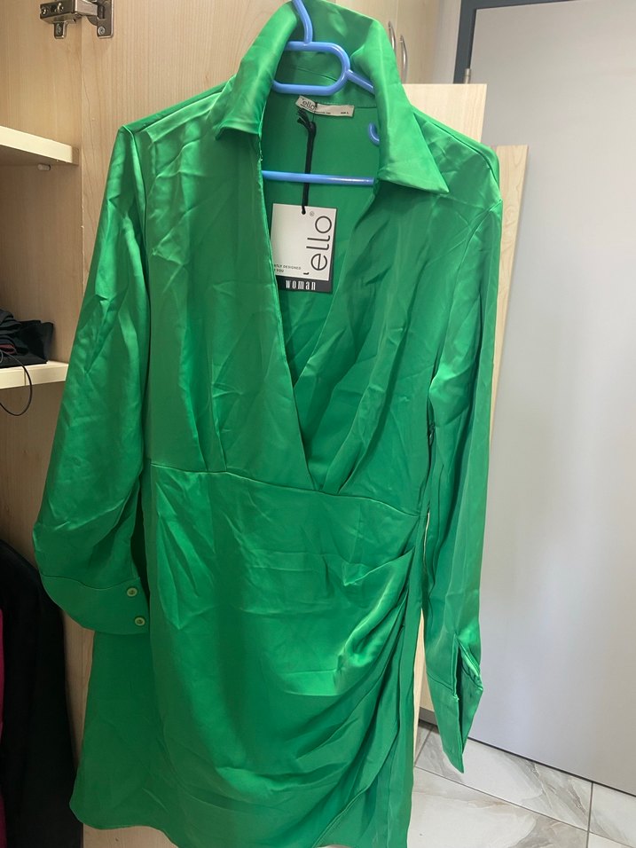 Parlak yeşil kumaştan, uzun kollu ve vücuda oturan midi boy kadın elbisesi. Sokak tarzına uygun, baskılı desene sahip.