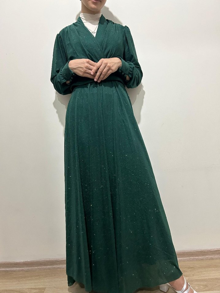 Parlak yeşil kumaştan, V yakalı ve drapeli uzun kadın elbisesi. Uzun kollu, bol kesimle rahat ve mütevazı bir tarz sunar. Günlük kullanıma uygundur.