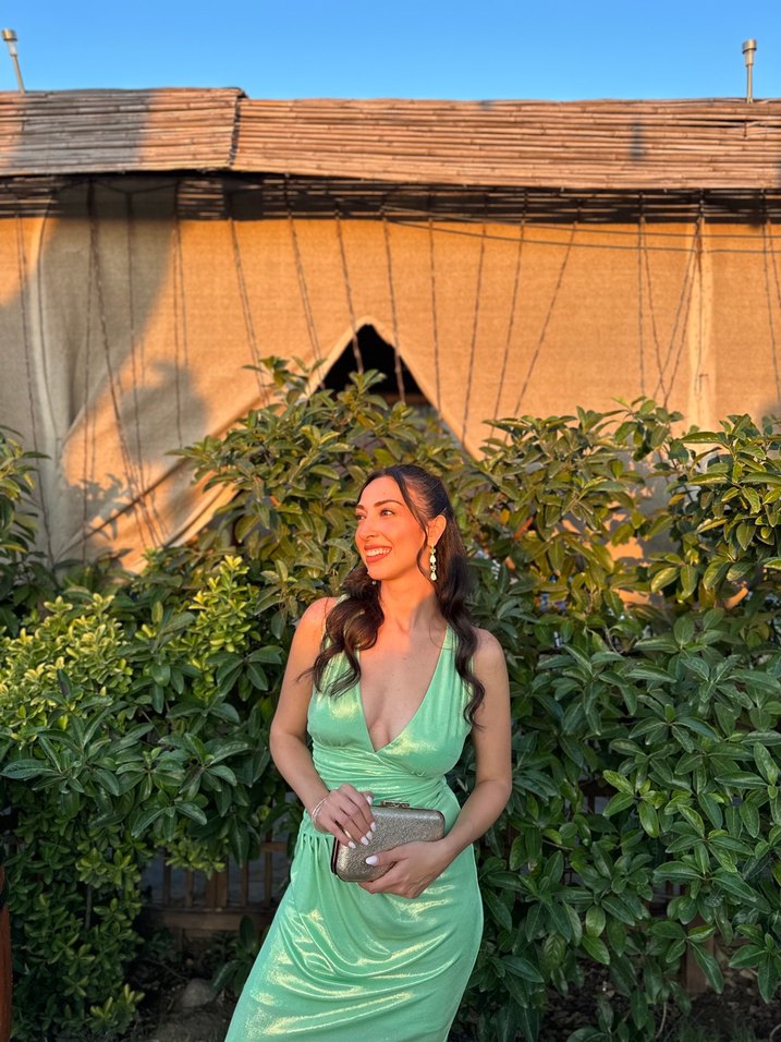 Parlak yeşil tie-dye desenli, V yakalı, drapeli ve uzun kesimli, vücuda oturan elbise. İnce askılı kollarıyla cesur bir görünüm sunar. 1 kez giyildi.