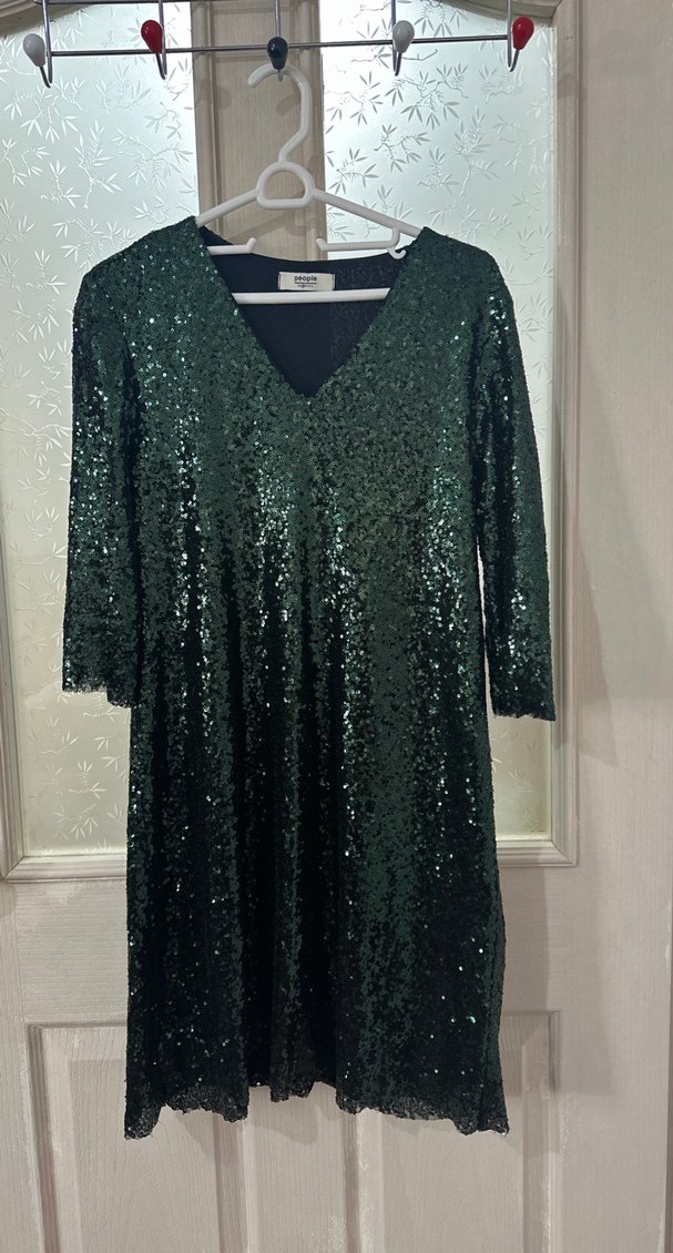 Parlak pullarla kaplı, V yakalı ve uzun kollu koyu yeşil midi elbise. Salaş kesimi ve yılan desenli modeliyle parti ve sokak tarzına uygun.