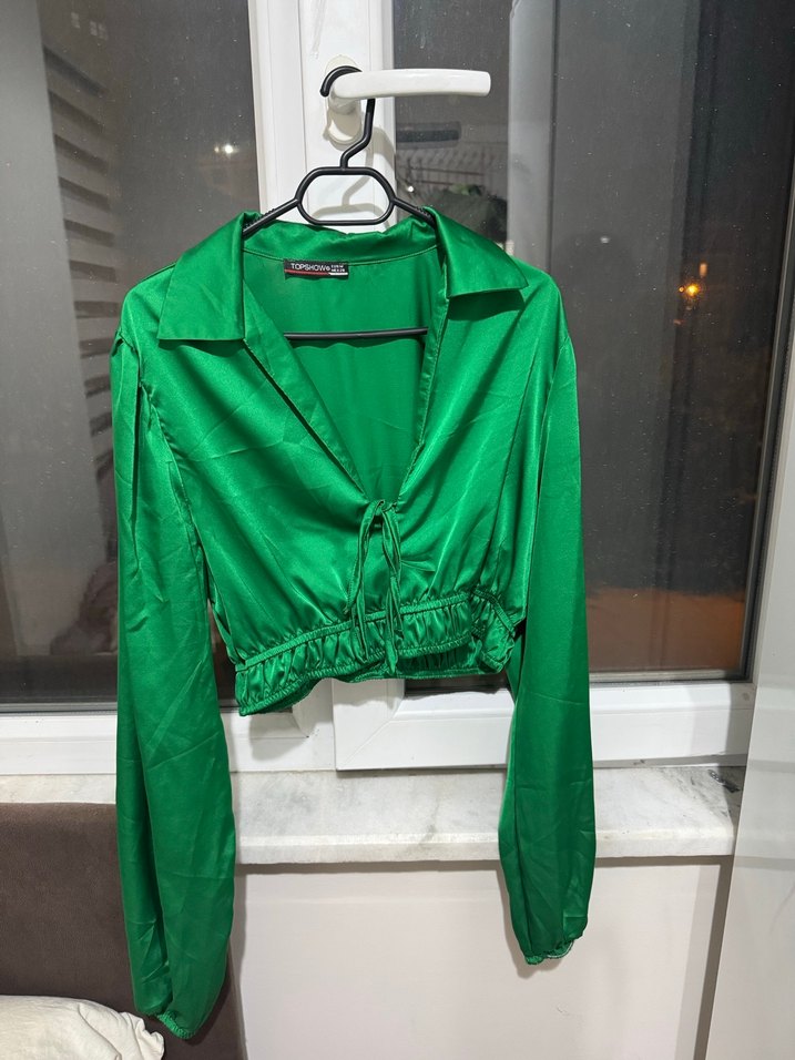 Bu kadın gömlek, uzun kollu, V yakalı ve düğmeli detaylara sahiptir. İpeksi kumaştan yapılmış, parlak yeşil renkte ve kısa boydadır, sokak stiline uygundur.