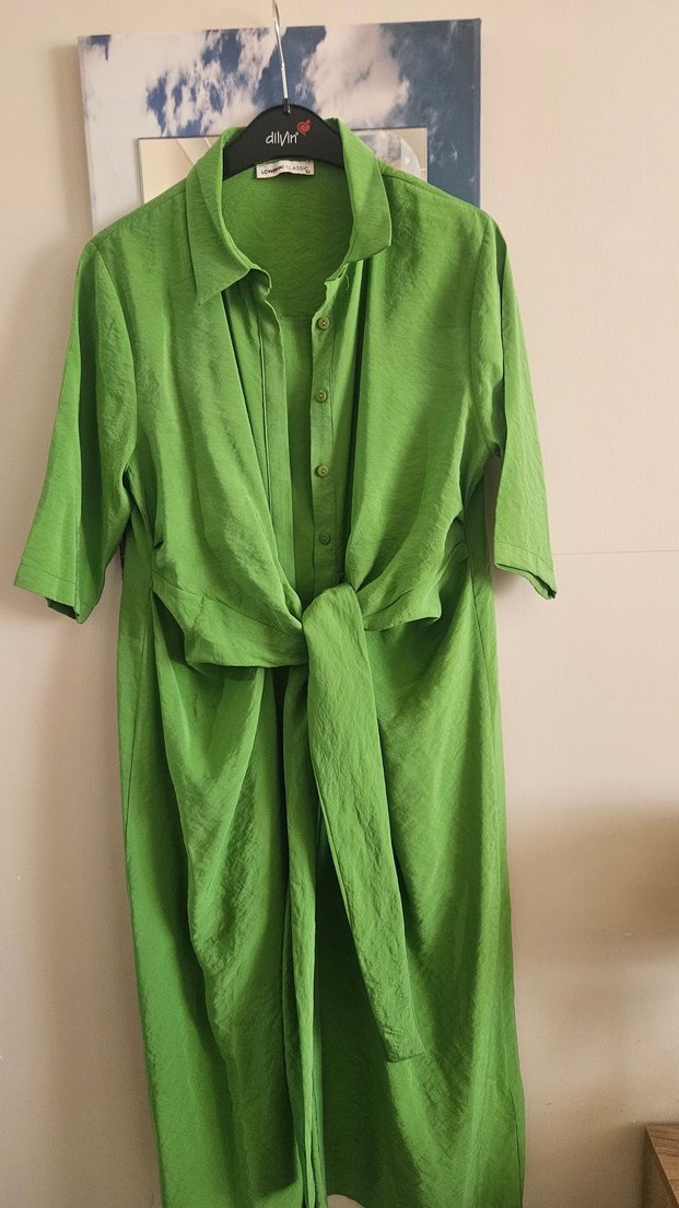 Parlak yeşil renkte, yarım kollu, salaş kesim uzun kadın elbisesi. Minimalist ve normcore tarzda, önden düğmeli ve bel bağlamalıdır. kollarını kestirdim yarım kol olarak gönderilecektir.