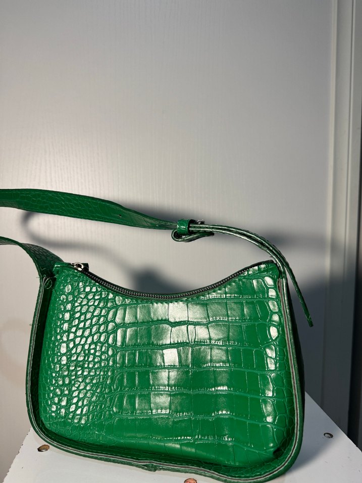 Parlak yeşil çanta, yılan derisi deseni ve tokalı askı ile trendy günlük sokak giyimine uygun.