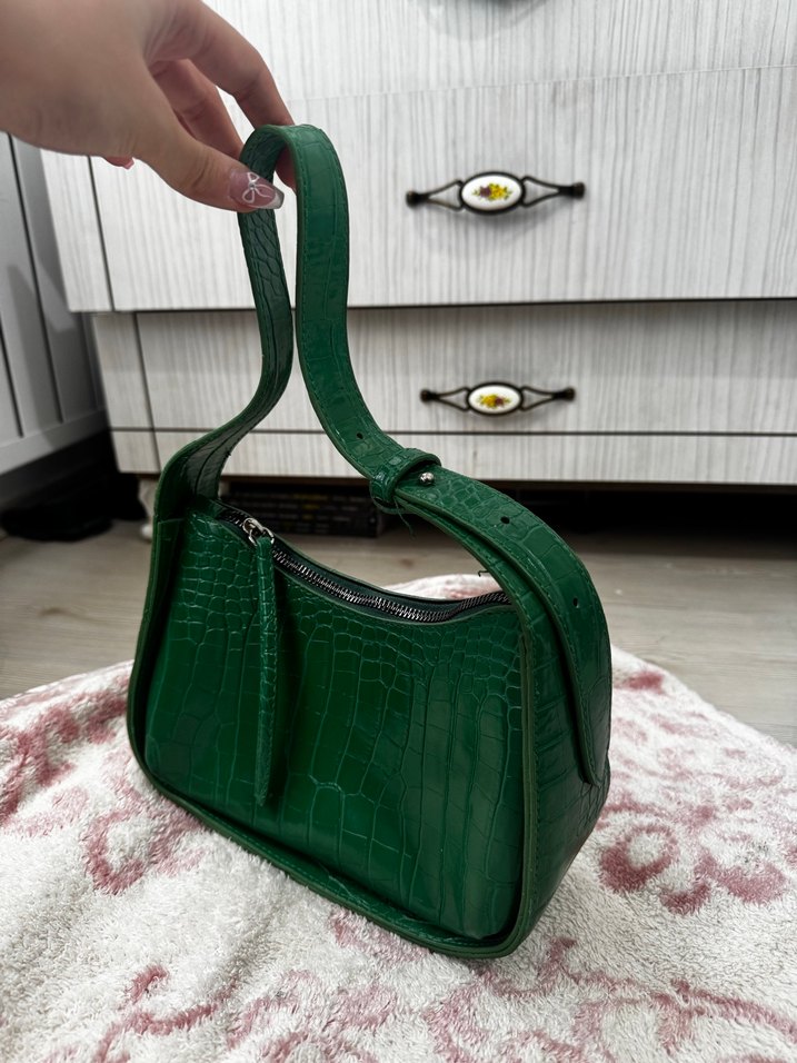 Parlak yeşil deri, yılan deseni ve tokalı askıya sahip kadın çanta, çağdaş Paris tarzıyla klasik zarafeti yansıtıyor.