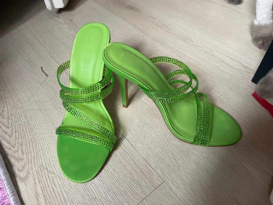 Parlak yeşil yılan desenli, pul işlemeli lastik stiletto topuklu. Cesur ve çağdaş parti ayakkabısı.
