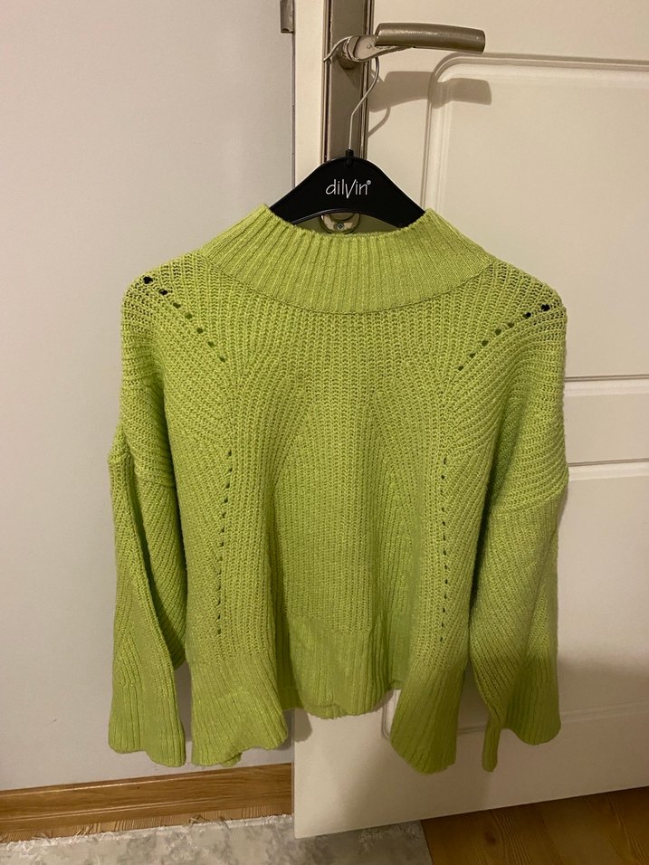 Bu triko kazak parlak yeşil renkte, yüksek yakalı ve uzun kolludur. Salaş kesimi ve midi boyu ile rahat sokak tarzına uygundur. Ufak bi lekesi var çıkarmak için uğraşmadım ama çıkar leke çıkarıcım yok benim deneyemedim