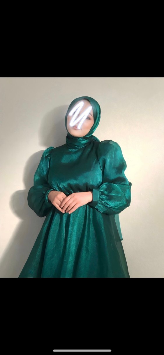 Parlak yeşil renkte, yüksek yakalı ve uzun kollu, bol kesim drapeli uzun elbise. Modest sokak stili için uygun. ✨