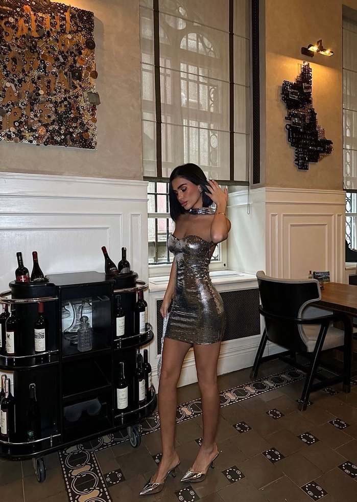 Bu dar kesim, askılı straplez mini elbise, parlak gri yılan derisi desenli deri ve payet detaylarıyla dikkat çeker, parti için uygundur. ✨