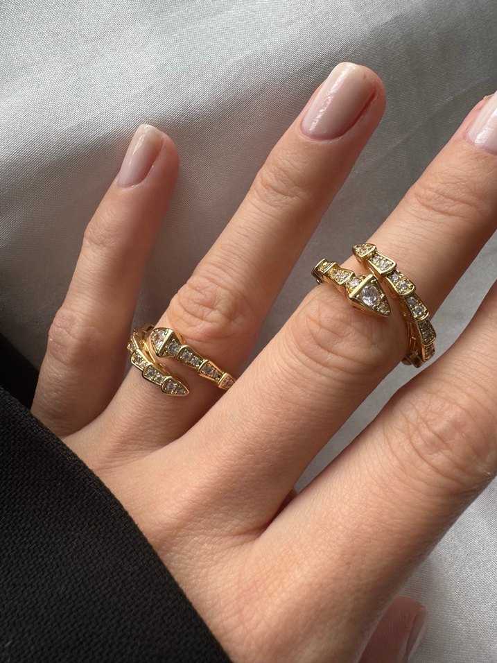 Altın renginde, parlak yılan desenli yüzükler, klasik zarafetle modern tarzı romantik akşamlar için birleştirir.