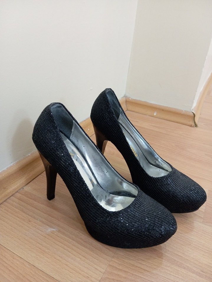 Klasik zarafette, parlak yılan desenli ve ışıltılı siyah ince topuklu ayakkabılar. Kauçuk malzemeden, romantik akşamlar için uygun.