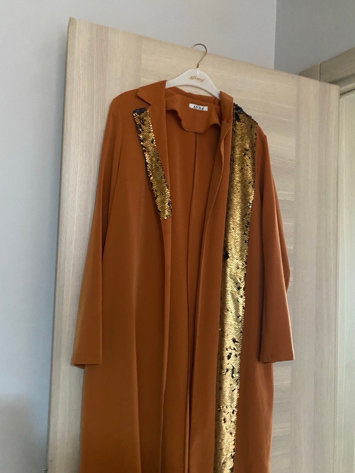 Uzun boylu, bol kesim, uzun kollu kahverengi kadın elbisesi, parlak yılan deseni detayına sahip. Modern ve minimal tarzda tasarlanmıştır.