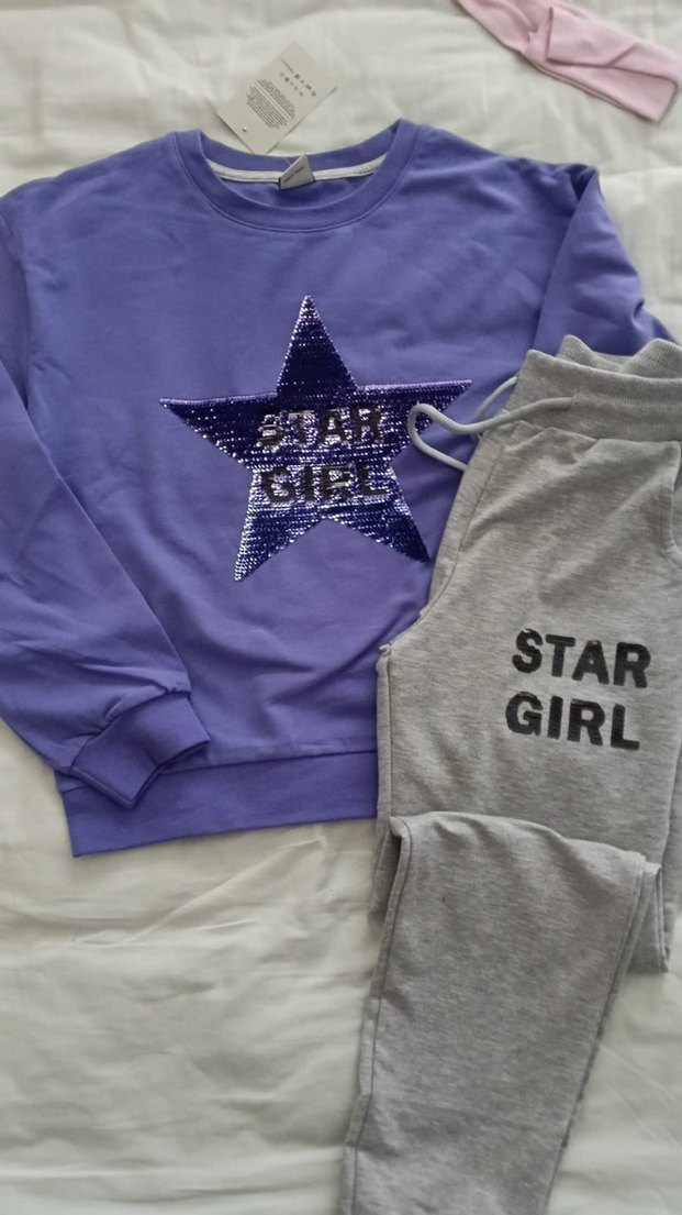Mor uzun kollu sweatshirt üzerinde parlak yıldız baskısı ve gri STAR GIRL yazılı eşofman ile bol kesim kızlar için rahat sokak stili takımı. Yumuşak ve sıcak kumaş.