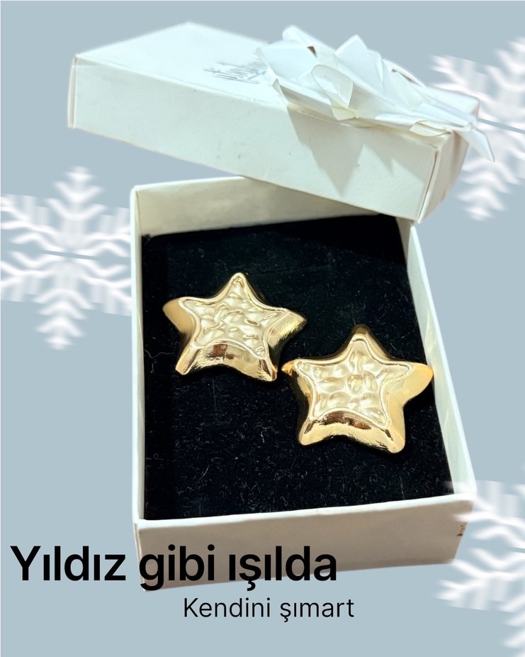Parlak altın yıldız figürlü, ışıldayan görünüme sahip küpeler. Minimalist ve mütevazı tarz için uygun. "Kendini şımart, yıldız gibi ışılda". ✨