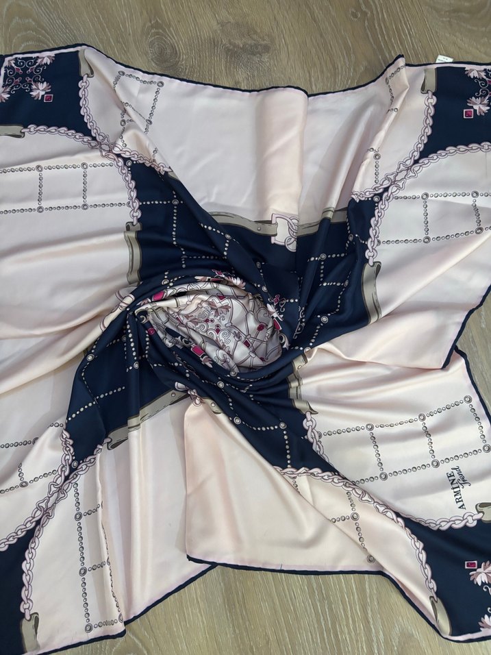 Parlak, çok renkli sentetik kumaştan yapılmış, zincir detaylı klasik Paris tarzı kadın fularıdır.