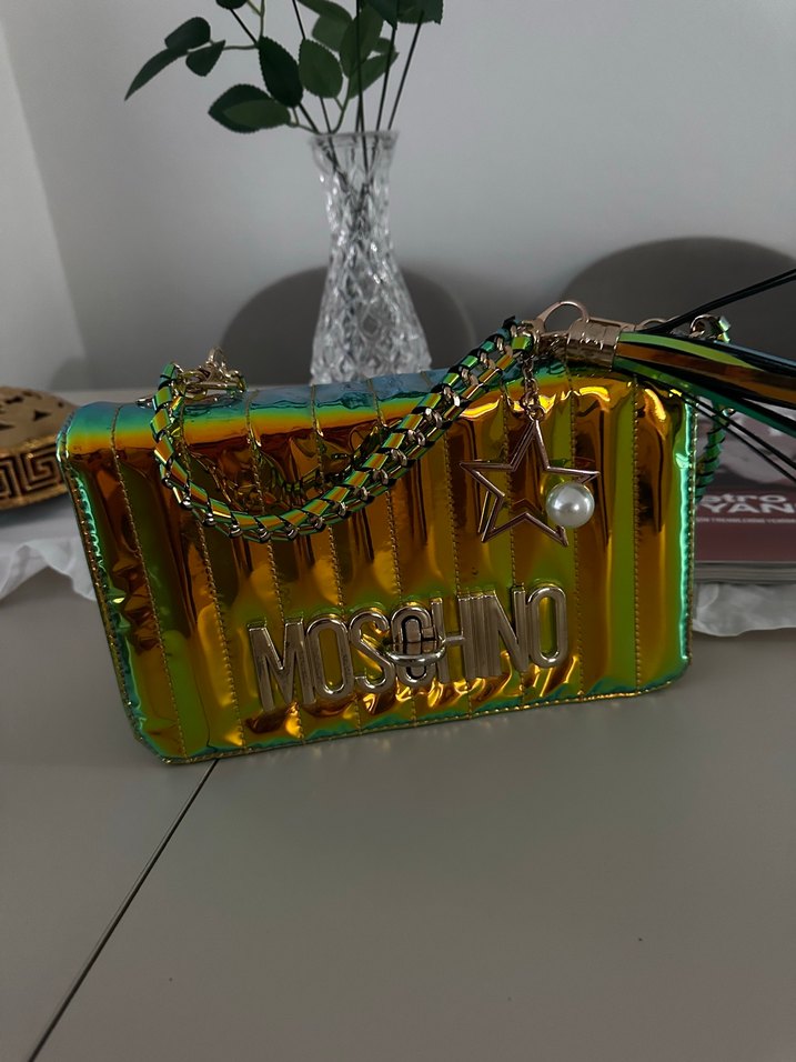 Parlak, çok renkli Moschino , zincir detaylı, baskılı. İthal bir çanta hiç deformesi yok.