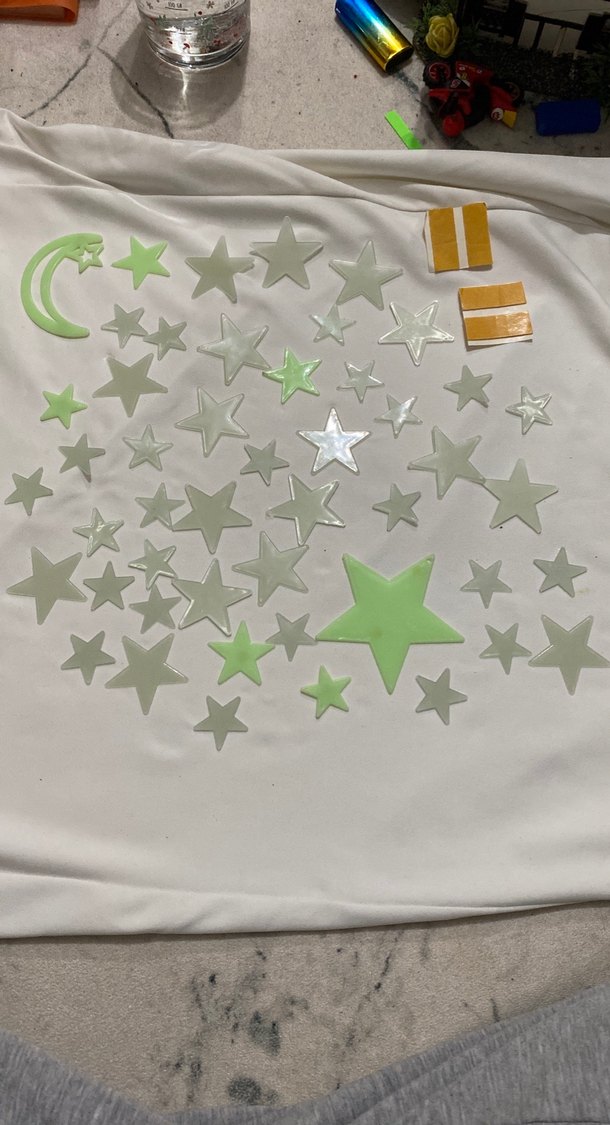 Gece bir müddet ışık aldıktan sonra parlar Farklı boyutlarda, plastikten yapılmış ve karanlıkta parlayan yeşil yıldız ve ay figürleri, çocuk odalarını süslemek için uygundur.