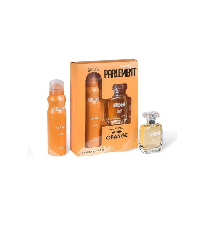 Parlement Orange kadın parfüm seti, 50 ml parfüm ve 100 ml vücut spreyi içerir. Ferah portakal notalarıyla öne çıkar.