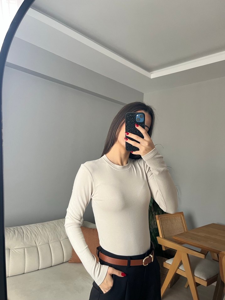 Bej renkli, uzun kollu ve pamuklu kumaştan yapılmış, vücuda oturan bu bluz, yuvarlak yakasıyla minimalist ve zahmetsiz şıklık sunar. Günlük sokak stili için uygundur.