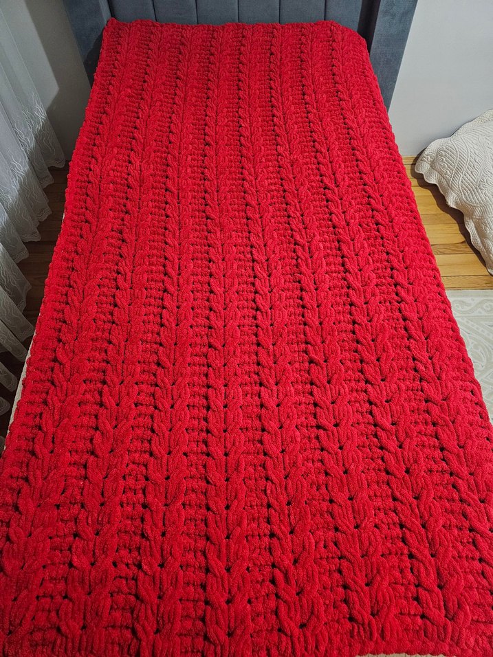 Koyu kırmızı renkte, kalın ve dokulu örgü desene sahip çocuk battaniyesi, sıcaklık ve konfor sağlar. eni 126 boy 180 istenilen Renge göre yapılır ölçüye göre fiyat verilir