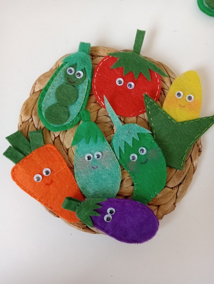Çocuklar için renkli keçeden, hareketli gözlü sebze figürlerinden oluşan eğitici oyuncak. keçe parmak kuklaları tanesi 20tl. son fiyattır.
