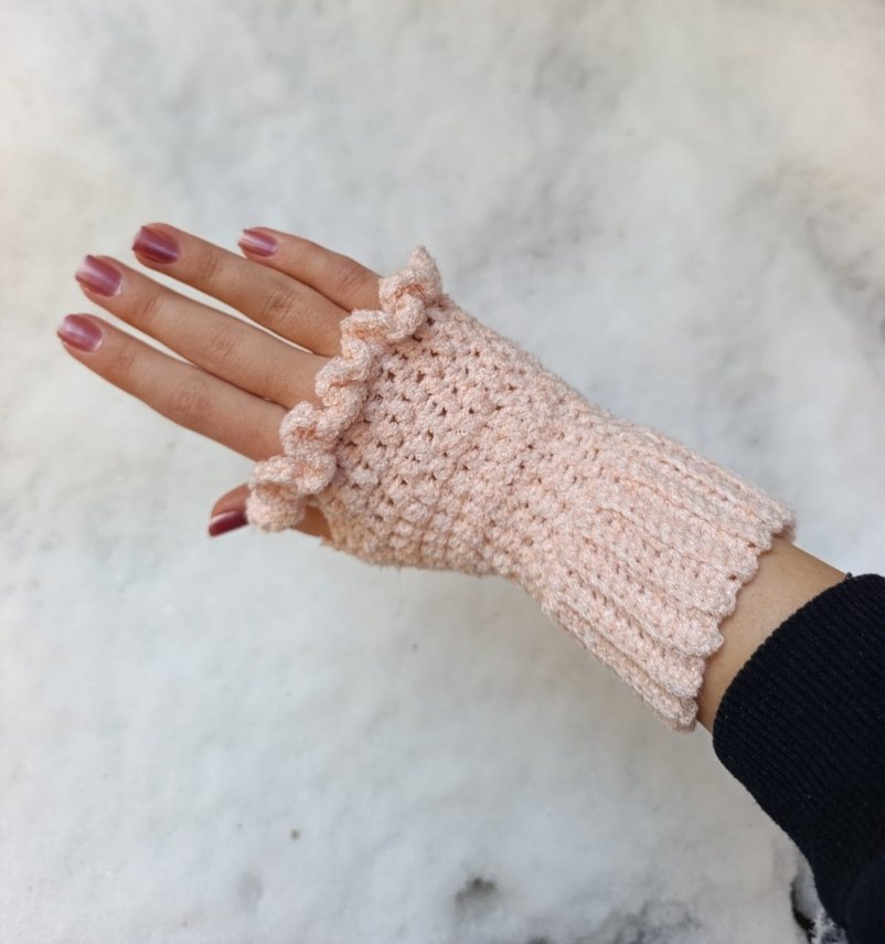 Pembe örgüden yapılmış, bohem tarzda ve fırfırlı manşetli kadın eldiveni. Pastel tonu yumuşak ve nostaljik bir hava katıyor. sıfır üründür isteğe özel renkler yapılır ( önce ilan açtırıp satın almanız durumunda ) görseller tamamen bana aittir.