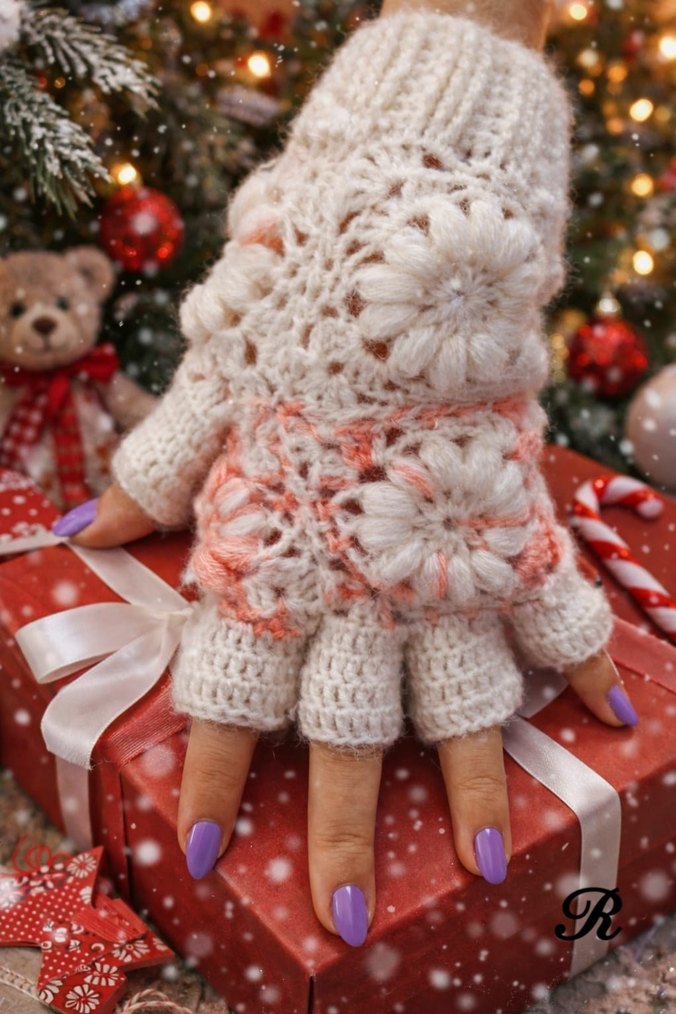 Beyaz pastel renkli, örgü çiçek desenli parmaksız eldivenler. Sıcak tutan, bohem ve retro tarzda bir görünüm sunar. ❄️
