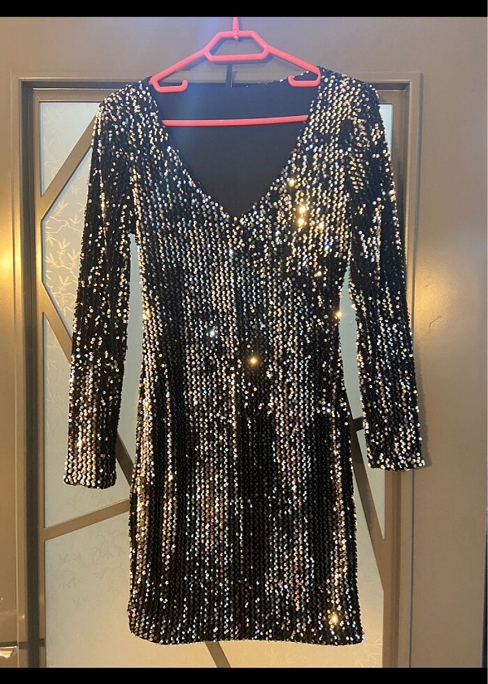 Kışlık kumaş üzerine pul işlemeli elbise sadece bir kez yılbaşında giyildi. Çok iyi durumda çok şık bir elbise