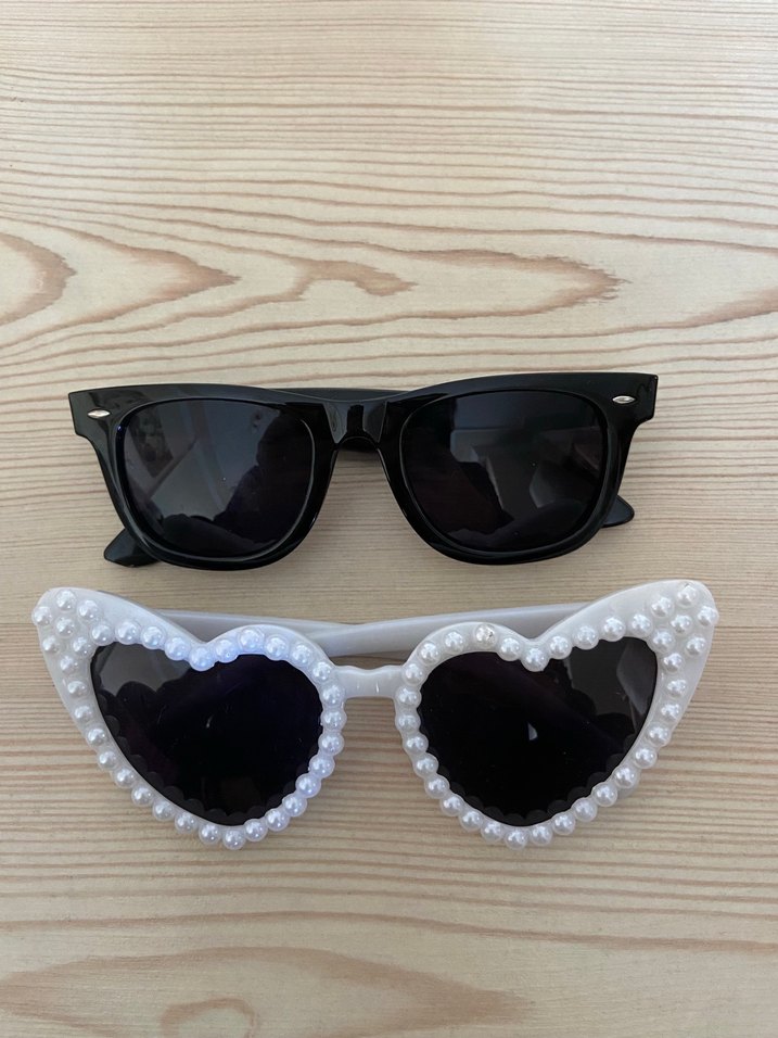 İnci boncuk detaylı beyaz kalp şeklinde güneş gözlüğü ve klasik siyah dikdörtgen gözlük. Retro ve bohem tarzını yansıtır. ️