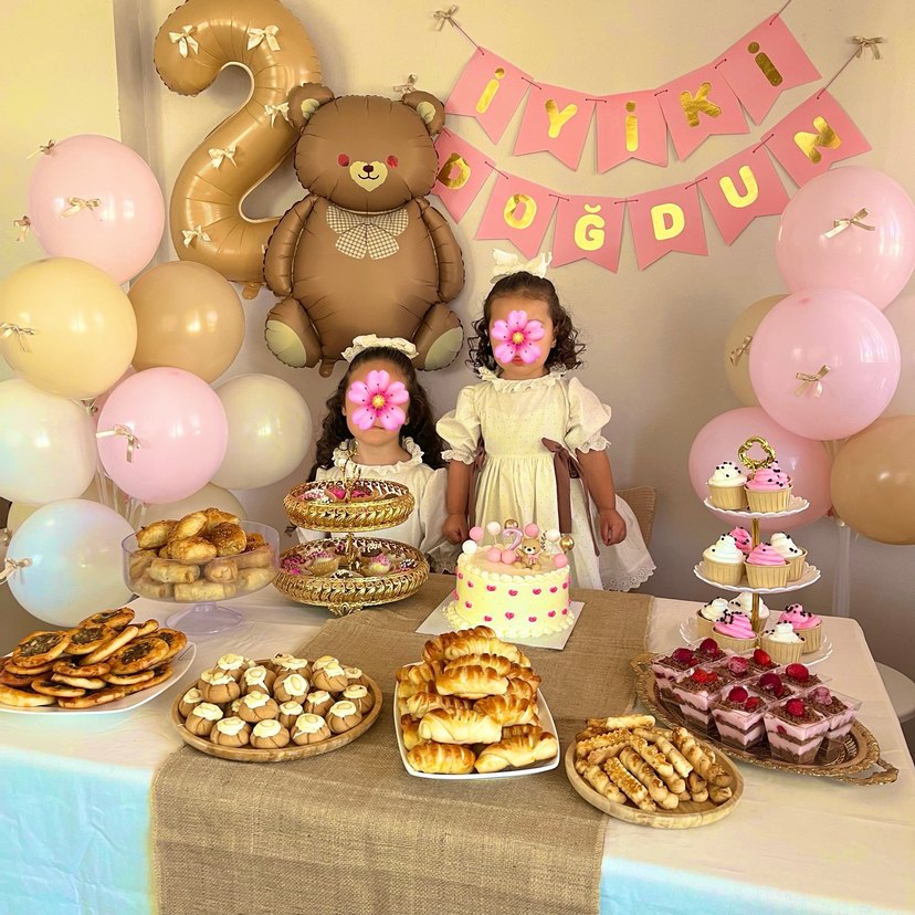 İyiki doğdun yazısı - ayıcık balon - 2 rakam balon ve üstündeki kurdaleler - balonlr ve üstündeki kurdaleler -10lu balon standı ve 7li stand masa üstündeki runner - 12 li kapkek kapsülü - ayıcık kürdan
