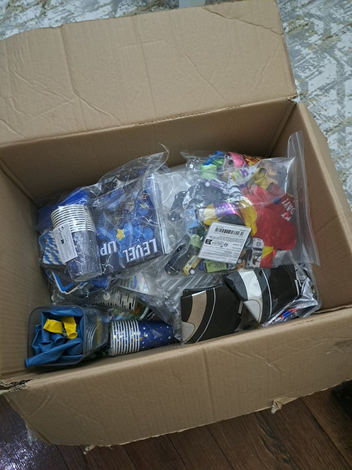 Karton kutuda mavi bardaklar, süslemeler ve balonlar içeren parti malzemeleri seti.