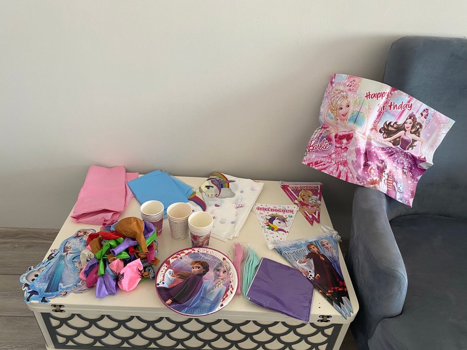 Frozen temalı parti için renkli balonlar, bardaklar, peçeteler, tabaklar ve afişler içeren set.Balonlardan birazı şişirilmişti.Hepsi sağlam 1 er kez kullanıldı.