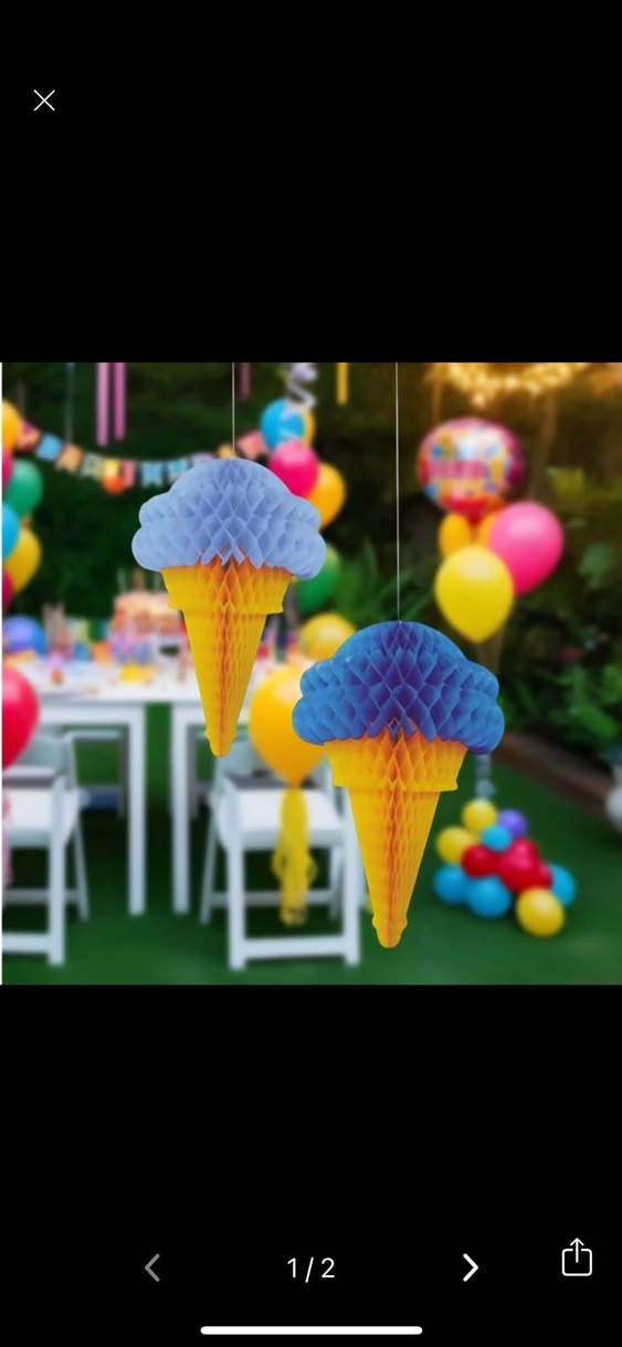 Lütfen yeni ilan açtırın. Doğum günü parti süsü. 2 adet dondurma. Petek süstür. 30 cm x 20 cm ölçüleri. Erkek çocuk parti süsleri. Rengarenk dondurma konisi şeklinde parti süsleri, kutlamalara neşe katmak için uygundur.