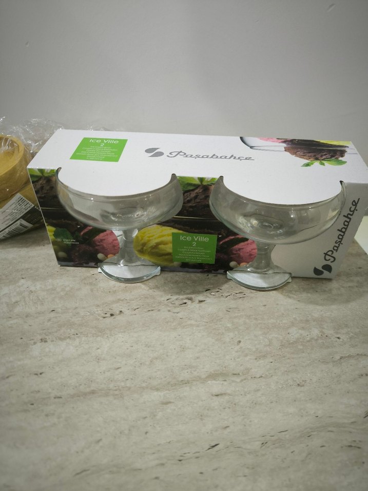 Paşabahçe'den 2'li cam dondurma kasesi, geniş ve sığ tasarımıyla tatlı servisi için uygundur.