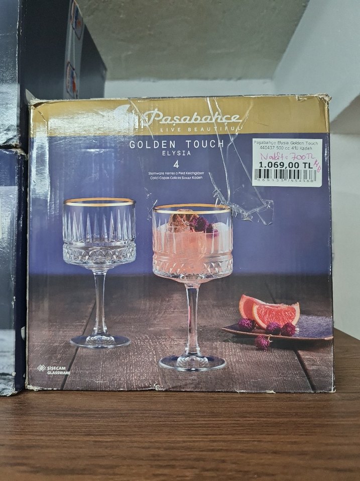 Pasabahçe Golden Touch set, koyu altın baskılı detaylara sahip 4 modern klasik kadehten oluşur, şık servis için idealdir.