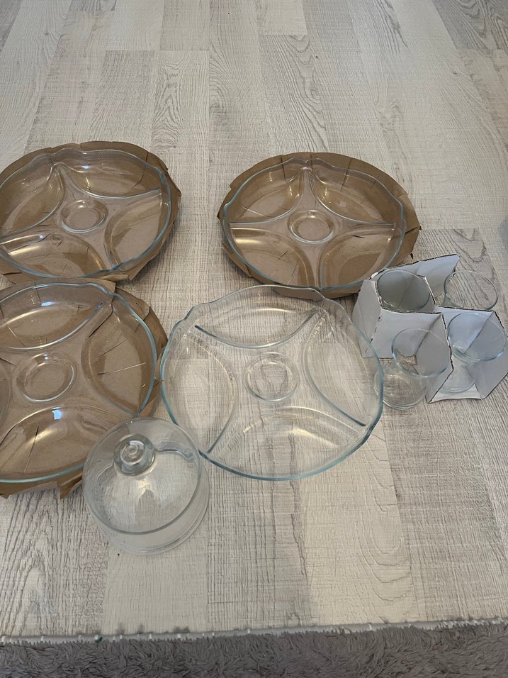 Bej ve gri tonlarda vintage tarzı, bölmeli cam tabak seti. Küçük cam kapak ve tutucular da dahil, atıştırmalıklar için ideal. ️