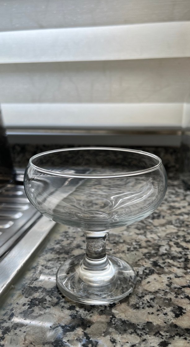 Kısa saplı, yuvarlak kase şeklinde şeffaf cam kadeh. Tatlı veya içecek sunumu için uygundur.