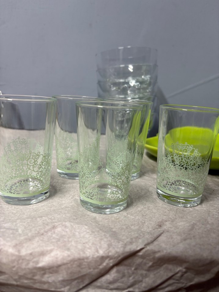 İçecek servisi için yeşil desenli, şeffaf cam bardak seti.