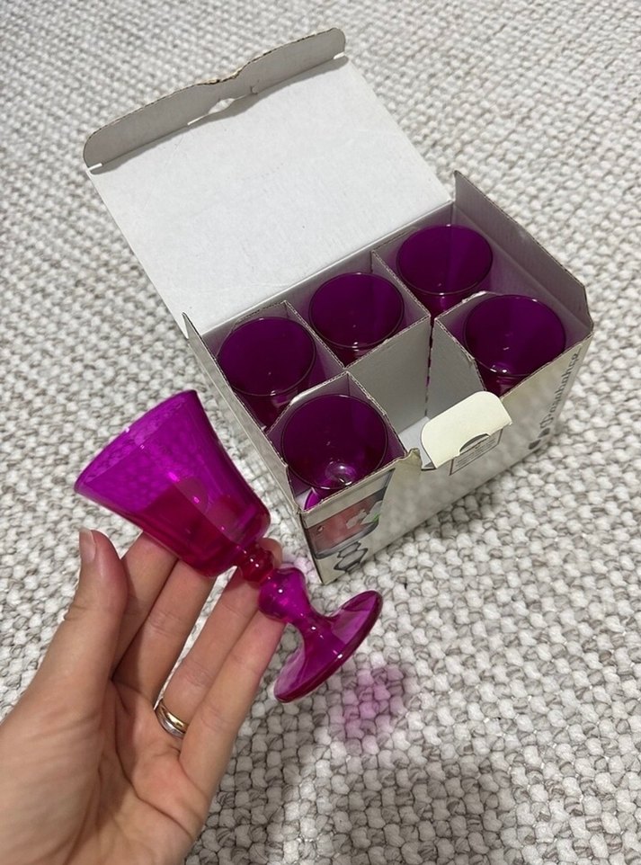 Klasik saplı koyu mor renkte altı adet kadeh seti.