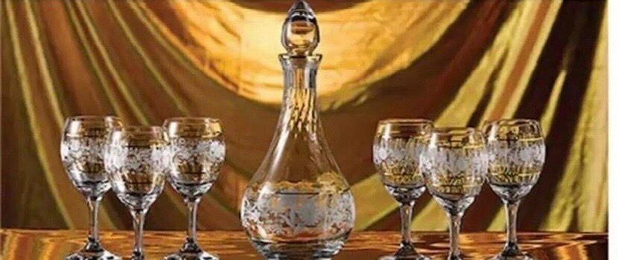 Parlak altın detaylı cam sürahi, kapağı ve ince desenleriyle masanıza şıklık katar. 7 parçadır