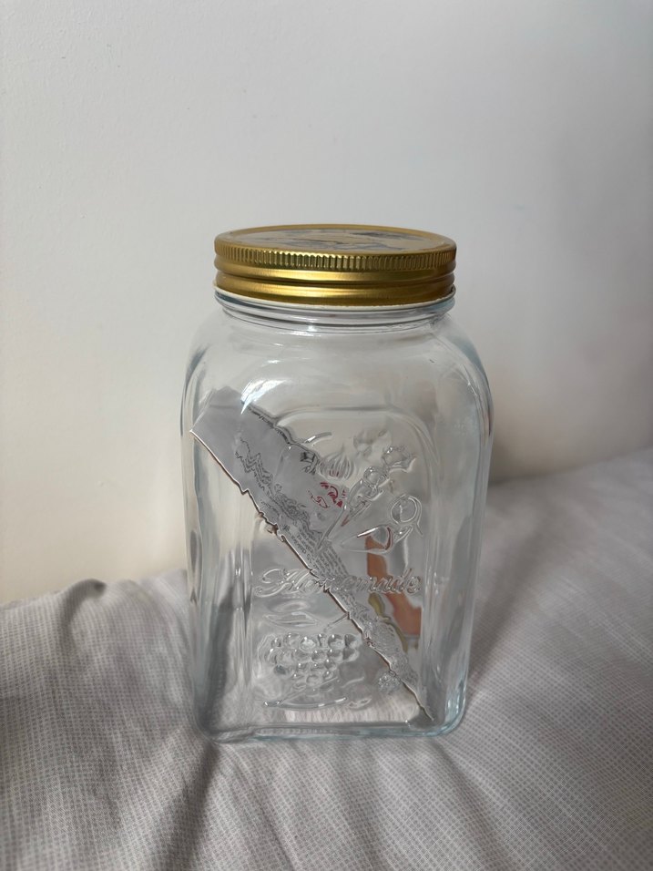 Şeffaf camdan yapılmış, üzerinde kabartma desenler bulunan ve açık altın renkli metal kapağa sahip vazo.