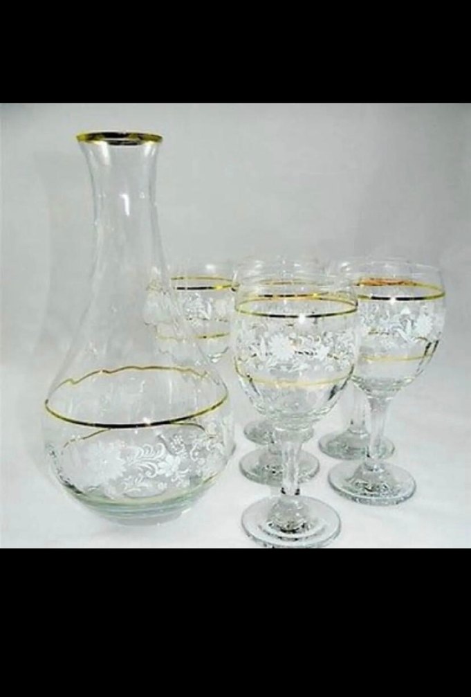 Beyaz çiçek desenleri ve altın şerit detayları bulunan cam sürahi ve altı bardaktan oluşan zarif bir set.