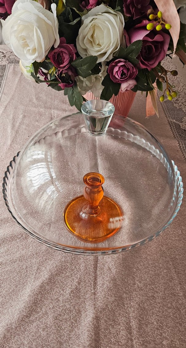 Paşabahçe.Turuncu ayaklı,şeffaf kulplu kapaklı kek fanusu.Ağız çapı 32.2 cm, yükseklik 26.2 cm.Kalın camdır.Ayak alt kısımda hafif renk soyulmaları olmuş,altta kaldığı için sorun teşkil etmiyor,yine de görsellerde paylaştım.Sağlam şekilde paketlenip gönderilecektir.